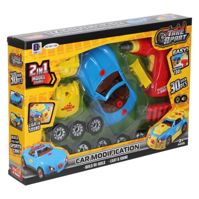 Automobilis su garsais ir šviesomis, surenkamas atsuktuvu
