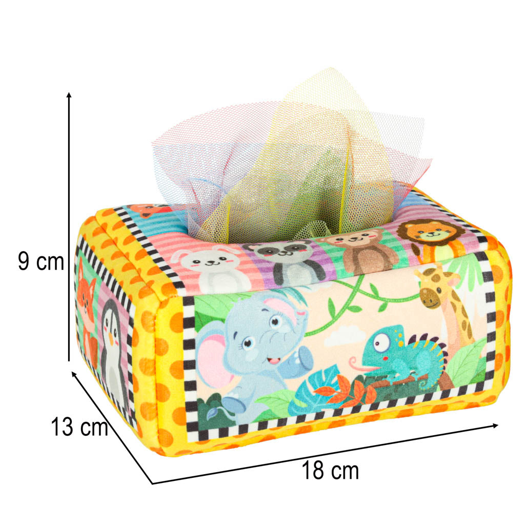 Sensorinis rinkinys mažiems vaikams. Minkšta dėžutė su čežančiomis sienelėmis ir 11 tinklelio servetėlių taip pat 3 storesnės čežančios servetėlės, viena jų su cypiančiu mygtuku.