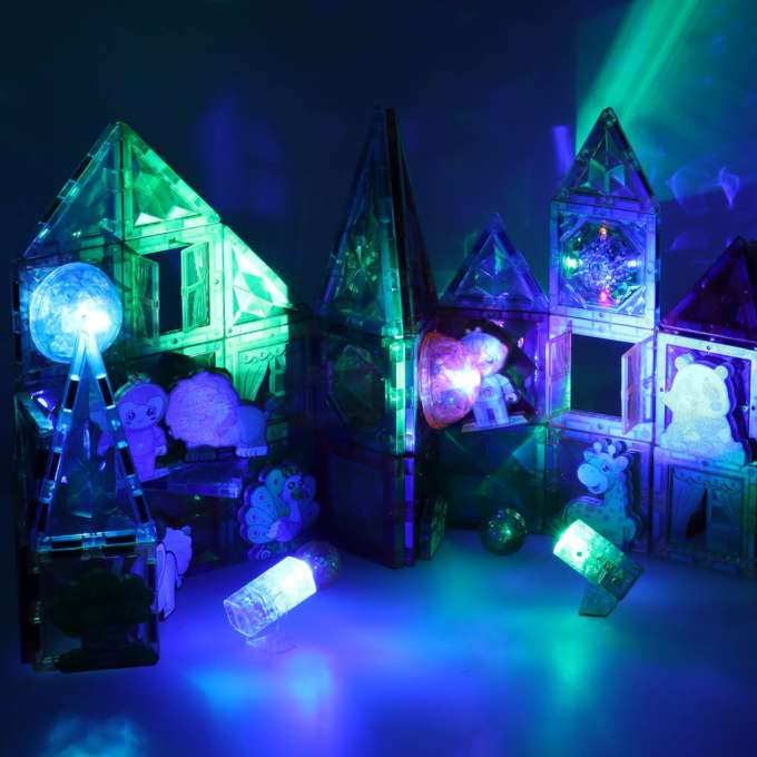 90 elementų magnetinis kaladėlių rinkinys su šviečiančiomis detalėmis.
