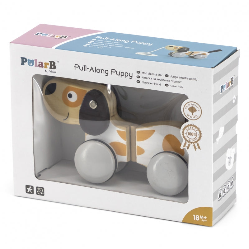 Labai tylus – guminės ratukų pagalvėlės nutildys bet kokius beldimo garsus. Kai mažylis patrauks virvelę, šuo pradės judėti ir linksmai vizgins uodegą.